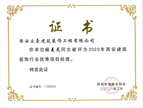 我公司資深項(xiàng)目經(jīng)理桂志平、高明明、張麥龍被評(píng)為2020年西安建筑裝飾行業(yè)優(yōu)秀項(xiàng)目經(jīng)理。